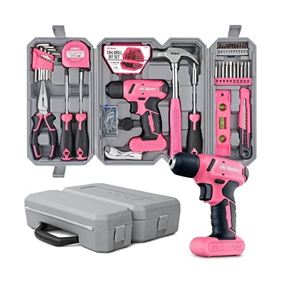 Hi-Spec, 57-częściowy zestaw narzędzi w kolorze różowym z akumulatorową wiertarko-wkrętarką USB 8 V