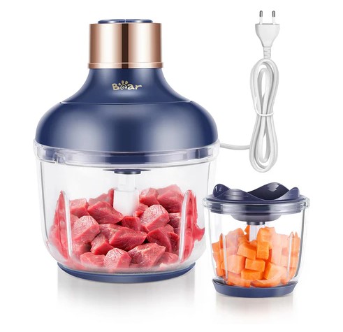 Bear 0,6L 2L elektryczny mini siekacz, 2 poziomy prędkości, siekacz z 4 ostrzami ze stali nierdzewnej i maszynką do mięsa, szklany pojemnik siekacz do mięsa (3782)