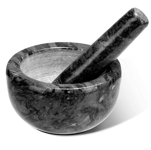 Zestaw moździerza i tłuczka Tera Marble Kitchen Mill wykonany z naturalnego marmuru w małym rozmiarze o średnicy 10 cm – ręczny młynek do przypraw, ziół, kruszarka do tabletek z tłuczkiem w kolorze czarnym (3809)