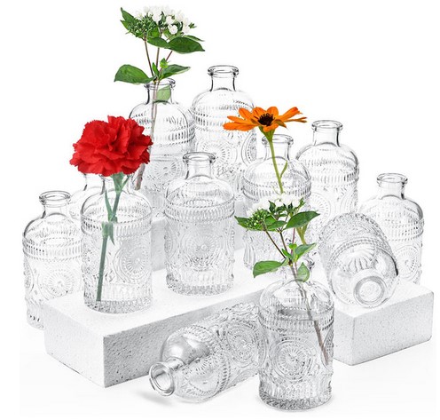Kingrol 12 sztuk przezroczystych szklanych wazonów, małe wazony na kwiaty, zabytkowe szklane butelki do dekoracji domowego biura, centralne elementy na stół weselny (3823)