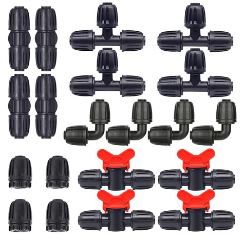 Zestaw złączy do nawadniania Hydrogarden 20 szt. do 1 2 rurek kroplujących – 4 trójniki, 4 złączki, 4 końcówki, 4 kolanka, 4 zawory przełączające – złącza z zadziorami (3835 )
