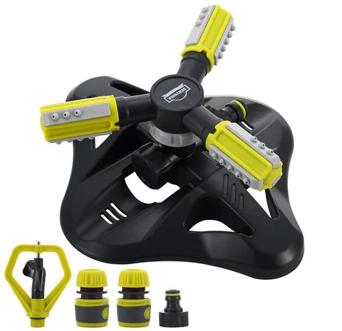 Zraszacz ogrodowy DEWINNER do trawnika, obrotowy, 360 stopni, automatyczne nawadnianie, 3 obrotowe ramiona, regulowane do roślin, kwiatów, warzyw, 2 okrągłe dysze natryskowe, 3 złącza (3816)