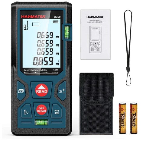 Dalmierz, cyfrowy dalmierz laserowy HANMATEK LM50 50M z podświetleniem LCD M In Ft z wieloma trybami pomiaru, takimi jak pomiary powierzchni, objętości odległości Pitagorasa, IP54 (3786)